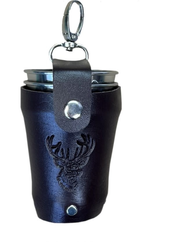 Beker set van 4 RVS bekertjes H5.7cm in lederen houder met Hert logo